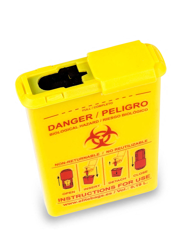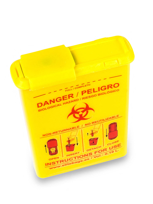 Abwurfbehälter für Kanülen und Ampullen zur Vermeidung von Verletzungen.